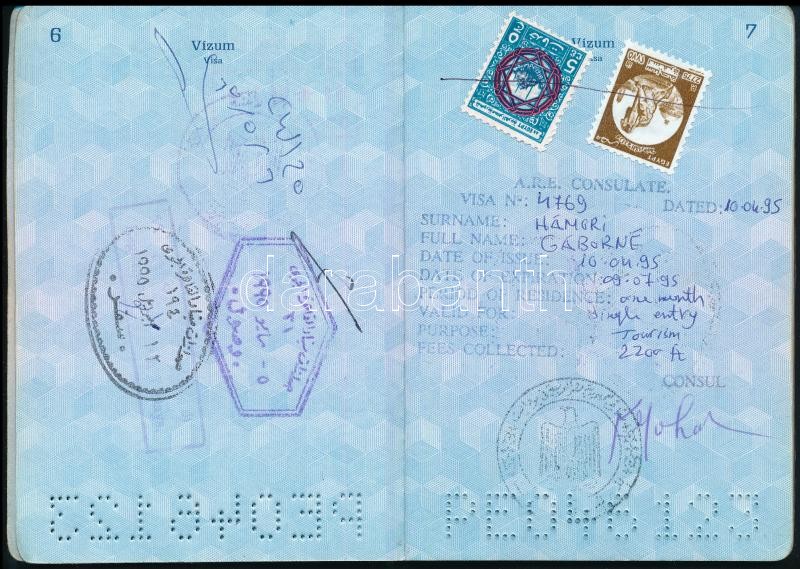 Leírás: 1993 Magyar útlevél, egyiptomi, török, bolgár bélyegzésekkel