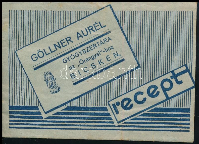 1931 Bicske, Göllner Aurél Gyógyszertára az "Őrangyal"-hoz gyógyszertá... https://www.darabanth.com/hu/364-Gyorsarveres/364.0/Mutargy-papirregiseg-egyeb/Reklam~500021/1931-Bicske-Gollner-Aurel-Gyogyszertara-az-Orangyal-hoz-gyogyszertari-recept-boritek-be~II2095806