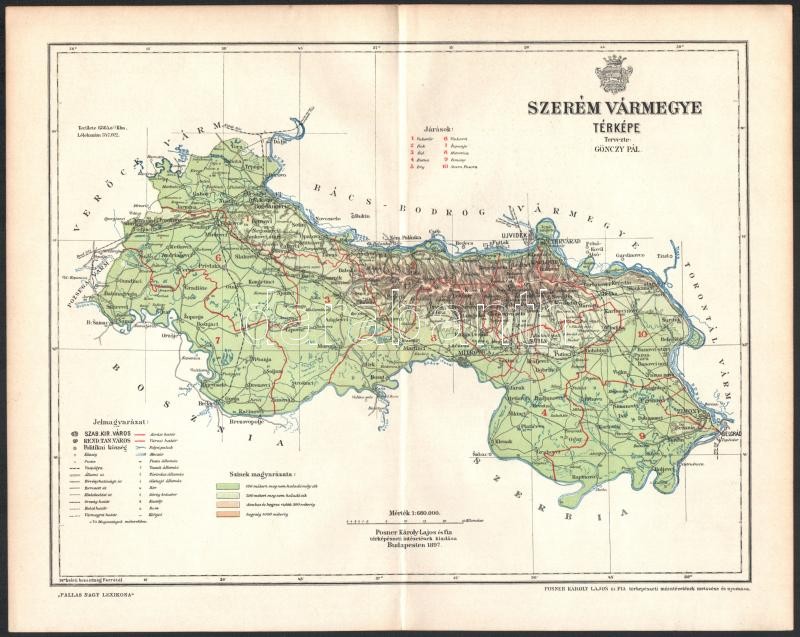 Leírás: 1897 Szerém vármegye térképe, tervezte: Gönczy Pál, Kiadja: Posner Károly Lajos és Fia, 24×29 cm