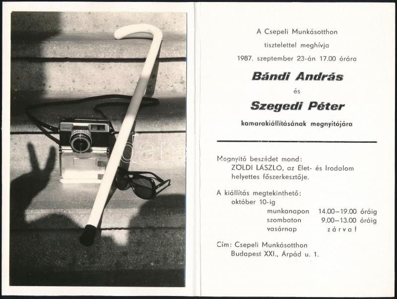 1987 Bándi András (?-?) budapesti fotóművész hagyatékából vintage fotóművészeti alkotás, amely egy kiállÃtási meghÃvójába van beragasztva, a magyar fotográfia avantgarde korszakából, 14x9 cm