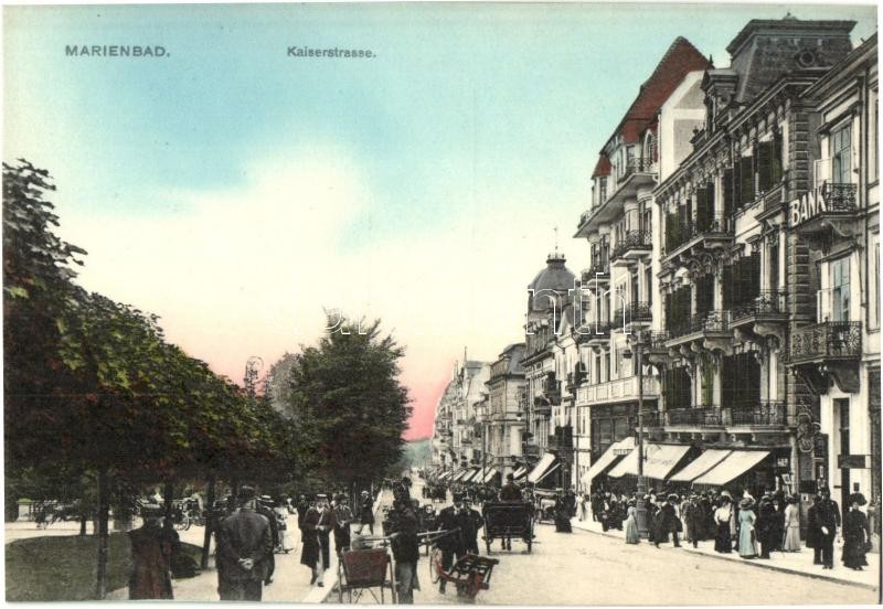 Marianske Lazne, Marienbad; Kaiserstrasse / street, bank https://www.darabanth.com/hu/365-Gyorsarveres/365.0/Kepeslapok/Cseh-Koztarsasag~1500052/Marianske-Lazne-Marienbad-Kaiserstrasse-street-bank~II1898562