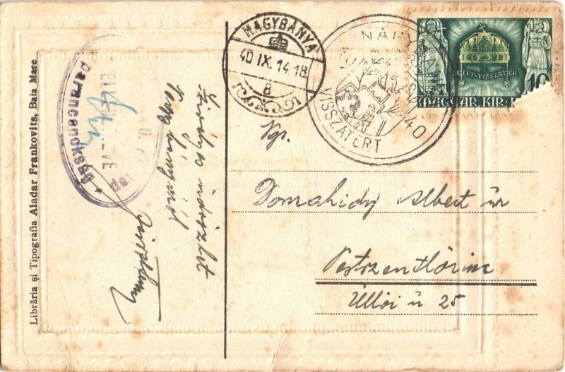 Leírás: 1940 Nagybánya, Baia Mare; Vedere Mixta / látkép, templom, Vajda Márton üzlete. fotó lapra ragasztva / general view, church, shops. photo glued on postcard + "1940 Nagybánya visszatért" So. Stpl. (ázott / wet damage)