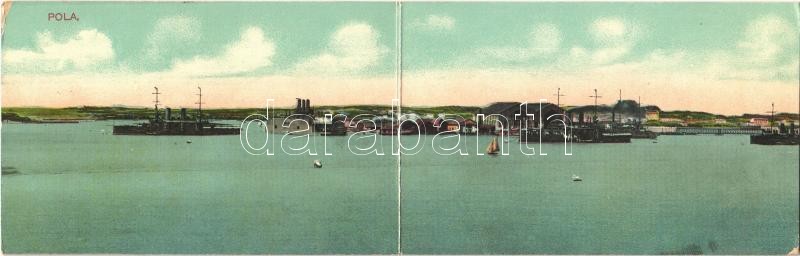 Leírás: Pola, Pula; Osztrák-magyar haditengerészet kikötője, hadihajók. Kihajtható panorámalap / K.u.K. Kriegsmarine / Austro-Hungarian Navy port, warships. Folding panoramacard (EK)
