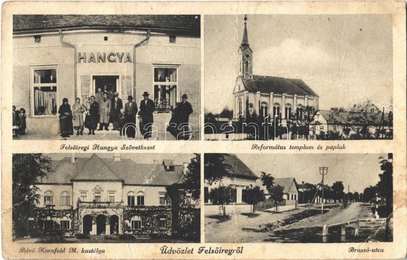 1941 Iregszemcse, Felsőireg; Református templom és paplak, Brassó utca, Báró Kornfeld M. kastélya, Hangya Szövetkezet üzlete. Tóth Szabó Gyula fényképész felvétele (fa)