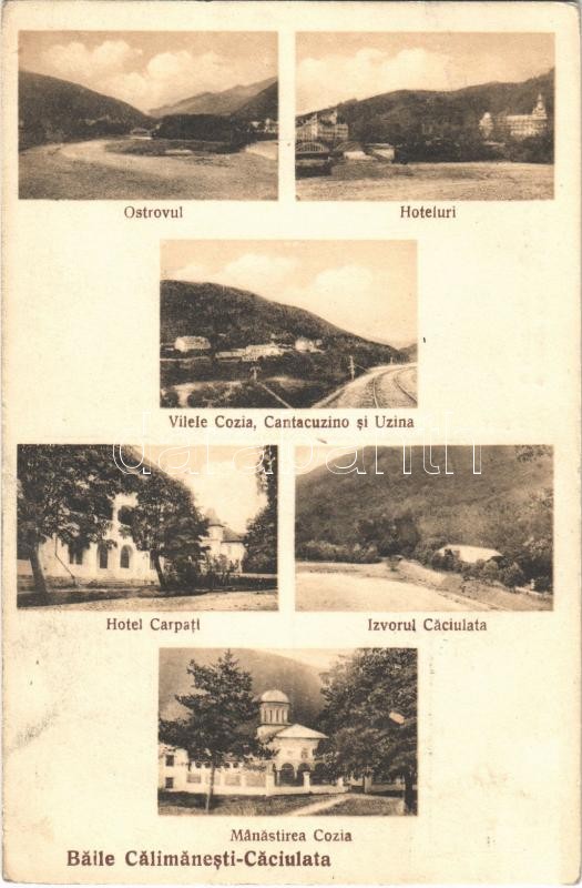 Leírás: 1929 Calimanesti-Caciulata, Ostrovul, Hoteluri, Vilele Cozia, Cantacuzino si Uzina, Hotel Carpati, Izvorul Caciulata, Manastirea Cozia / hotels, villas, thermal spring source, monastery (EK)