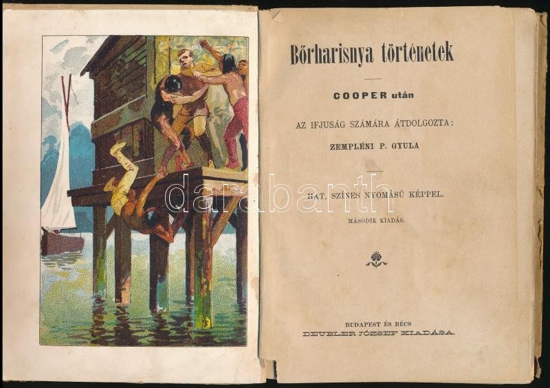 [J. F. Cooper]: Bőrharisnya történetek. Cooper után az ifjúság számára átdolgozta: Zempléni P. Gyula. Bp.-Bécs,én.,Deubler József,(Aikalay Adolf-ny., Pozsony), 102 p.+5 t. 2. kiadás. Kiadói illusztrált félvászon-kötés, kopott borítóval, a hátsó kötéstáblán sérüléssel, hiánnyal, egy tábla hiányzik, a címlap, a címkép és egy lap kijár. Ritka!