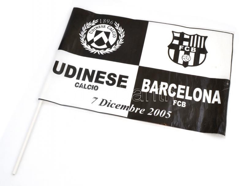 Leírás: 2005 Barcelona-Udinese műanyag zászló, kopásnyomokkal, 39×60 cm