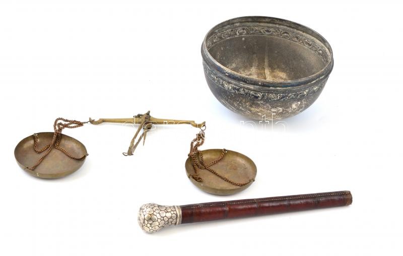 Leírás: 3 db-os kis bolha tétel: ezüst(Ag) végű sétapálca darab, kétserpenyős réz mérleg, fém tál