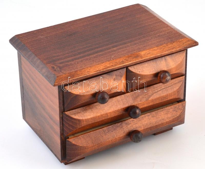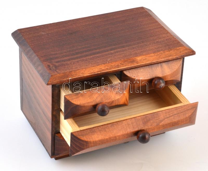 Leírás: Fából készült ékszeres fiókos szekrényke. 19x14 cm