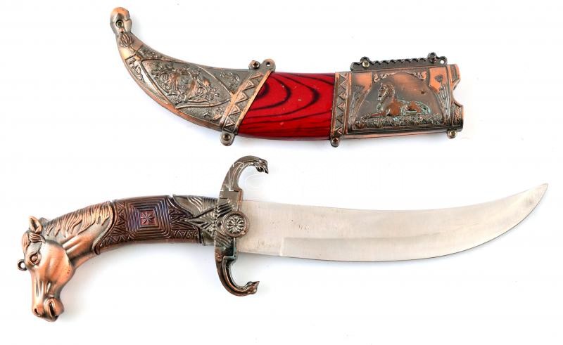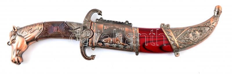 Leírás: Keleti stilusú, lófej markolatú dísztőr, szfinx-szel díszített tokkal, stainless steel pengével, laza markolattal, h: 30,5 cm, penge: 18 cm