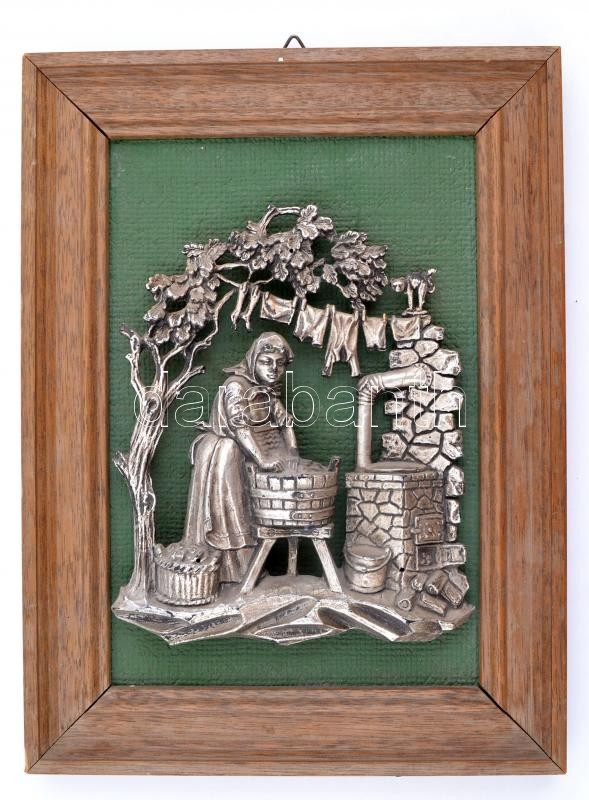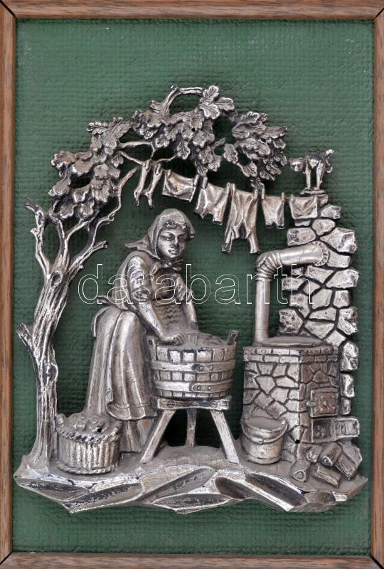 Leírás: Mosó asszony, préselt fém falikép, fa keretben, 18x14cm