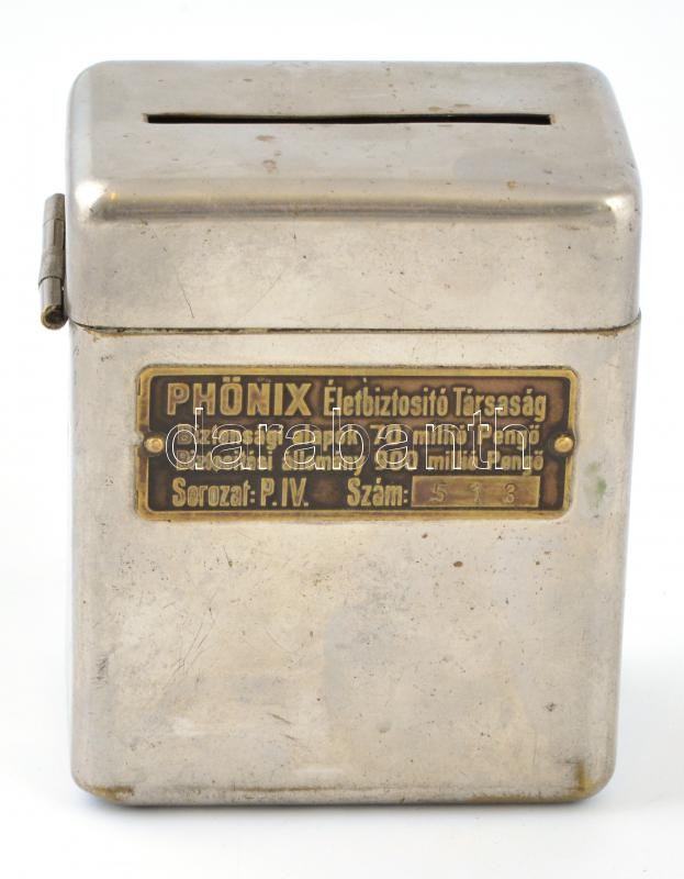 Leírás: Phönix Életbiztosító Társaság fém persely, kulcs nélkül, 9×5×10 cm