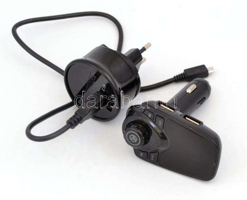 Leírás: Telefon töltő micro usb kábellel + autós rádi transzmitter USB és micro SD csatlakozással