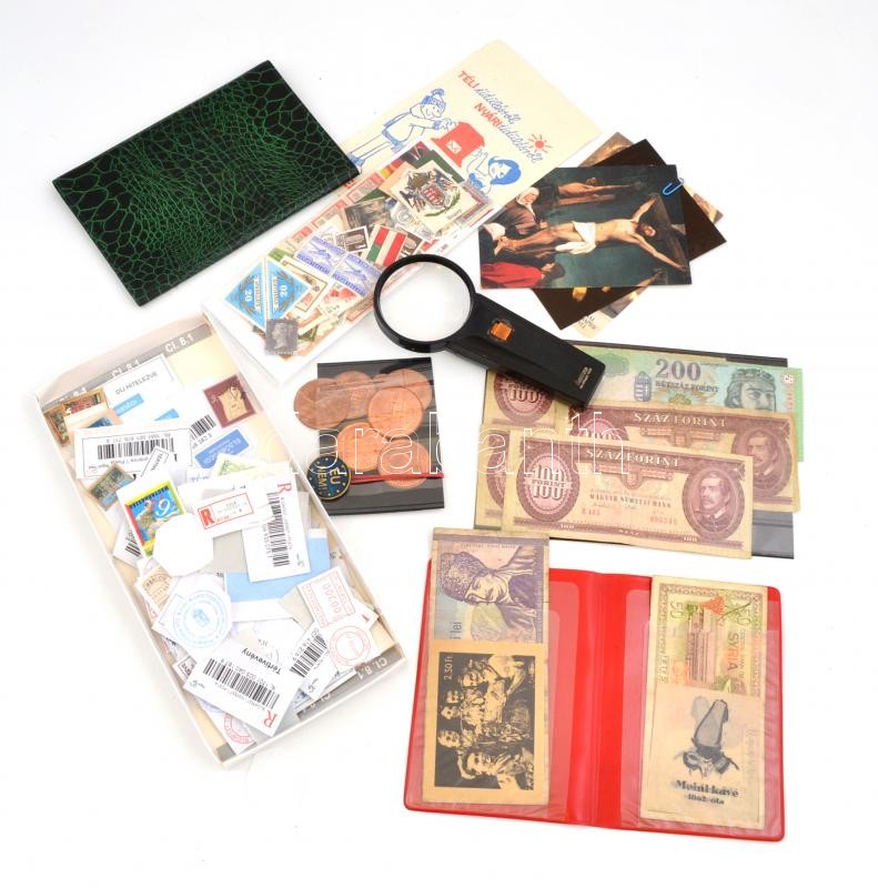 Leírás: Vegyes magyar és külföldi bélyegek, bankjegyek, túrajelvények, nagyító, néhány száz kivágás, ragjegyek, hivatali bélyezések...stb.