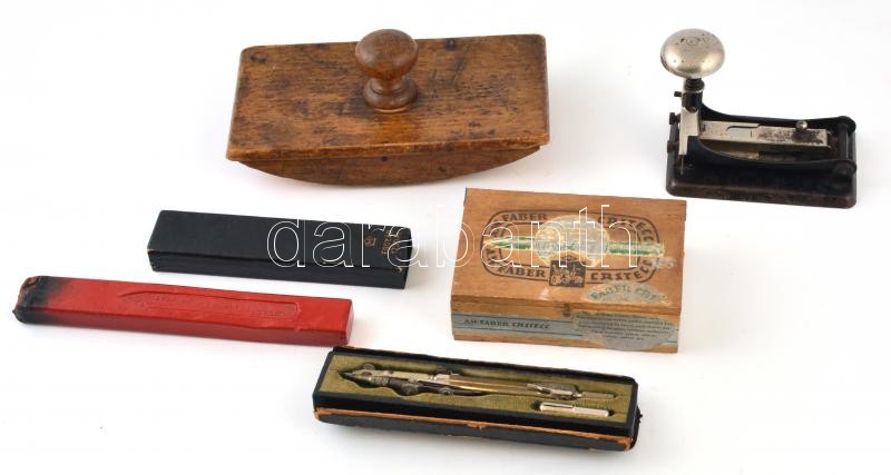 Leírás: Vegyes régi irodai felszerelés, összesen 6 db, köztük tűzőgép, pecsétviasz, tapper