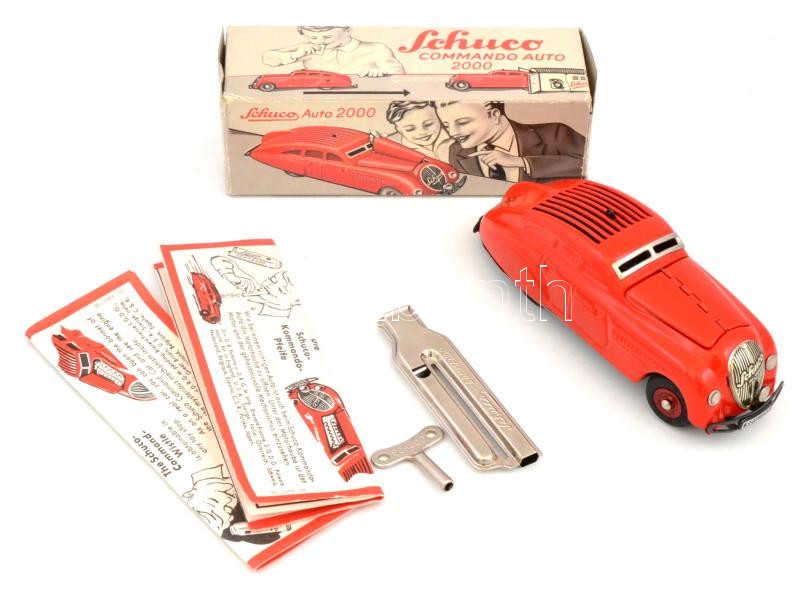 Leírás: Schuco Command Car 2000 felhúzhatós, többfunkciós játékautó, kulccsal, síppal, felhúzóval, eredeti dobozában, leírással, h: 14 cm
