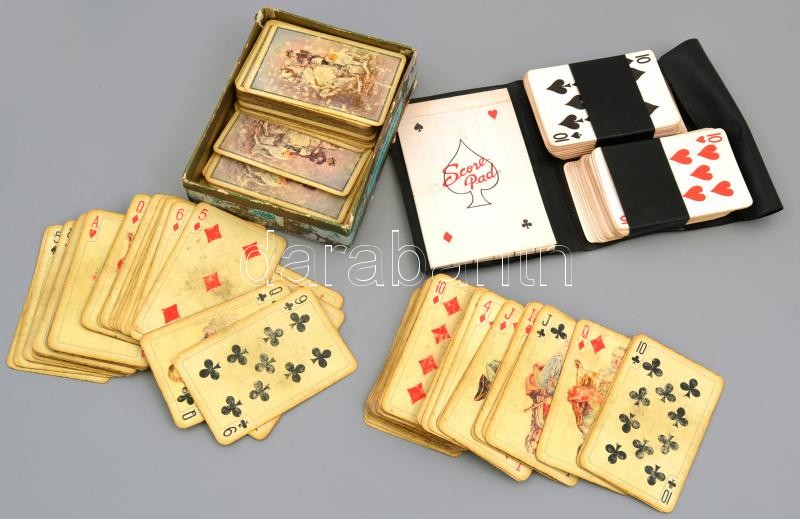 Leírás: Vegyes kártyatétel, 5 pakli póker kártya (54x2,52x2, és 46 lapos), két pakli hiányos kartondobozban, kettő műanyag tokban, 3 pakli kopott.