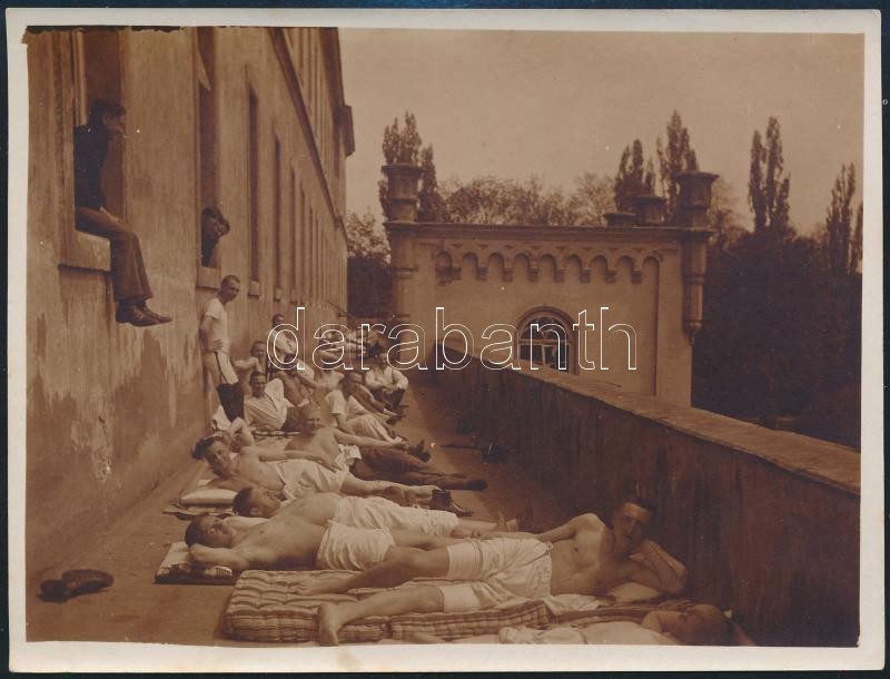 1907 Napfürdő a bécsújhelyi katonai akadémián, hátoldalon németül feliratozva, fotó, jó állapotban, 9×12 cm / Wiener Neustadt, military academy, sunbath