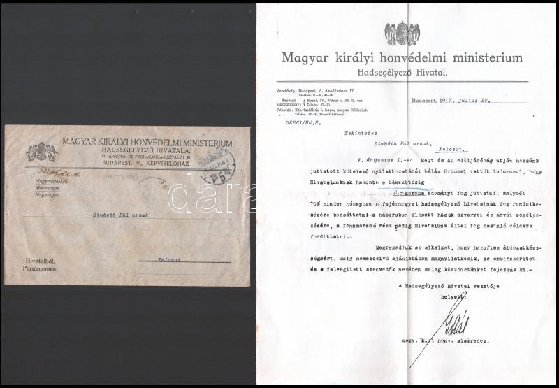 Leírás: 1917 Bp., M. Kir. Honvédelmi Ministerium Hadsegélyező Hivatalának fejléces, gépelt levele, borítékkal.
