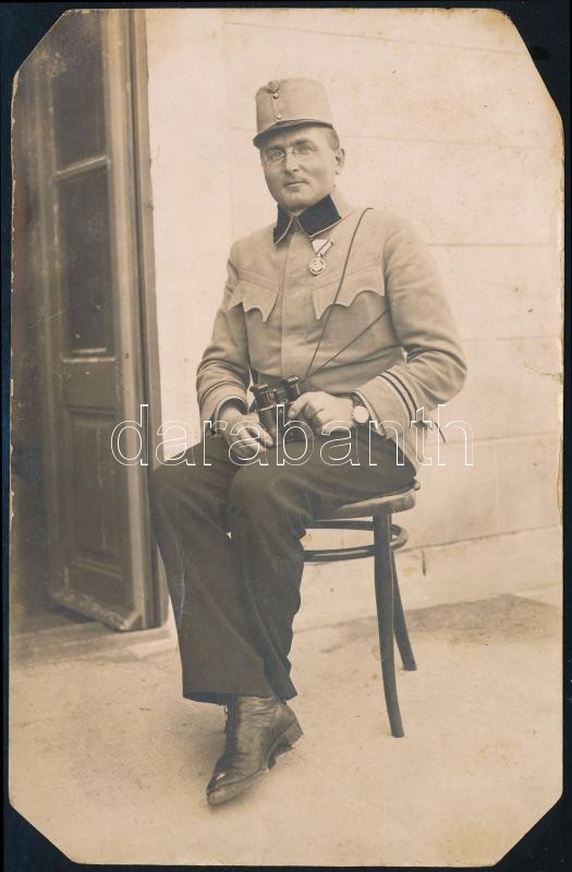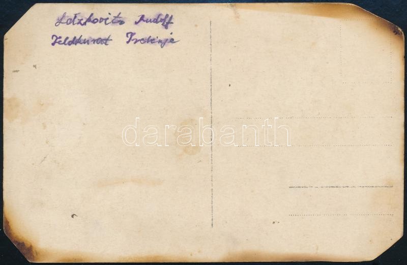 Leírás: 1917 Lotzkovits Rudolf K. u. k. Feldkurat (tábori lelkész) Trebinjében, hátoldalon feliratozott fotó, sarkainál vágva, 14×9 cm