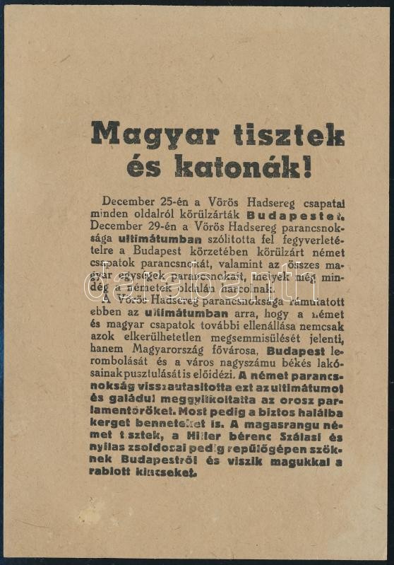 Leírás: 1944 A Vörös Hadsereg magyar honvédekhez intézett magyar nyelvű röplapja Budapest ostromával kapcsolatban