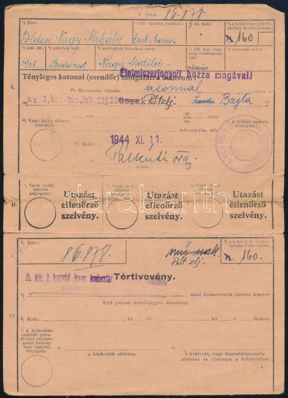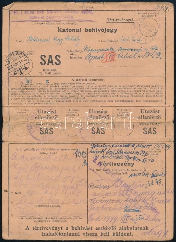 1944 Katonai (SAS) behívójegy,22x16 cm https://www.darabanth.com/hu/365-Gyorsarveres/365.0/Mutargy-papirregiseg-egyeb/Militaria~500026/1944-Katonai-SAS-behivojegy-22x16-cm~II2114508
