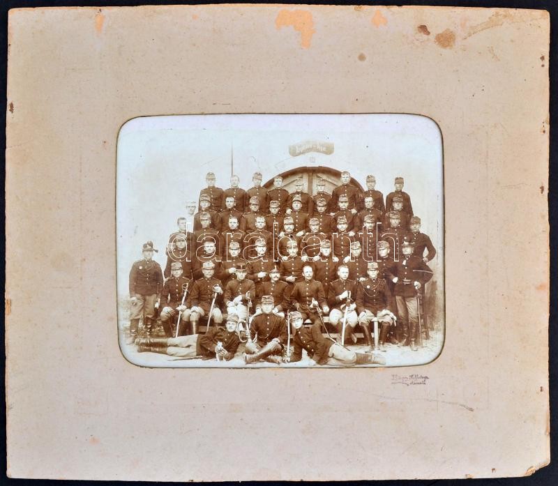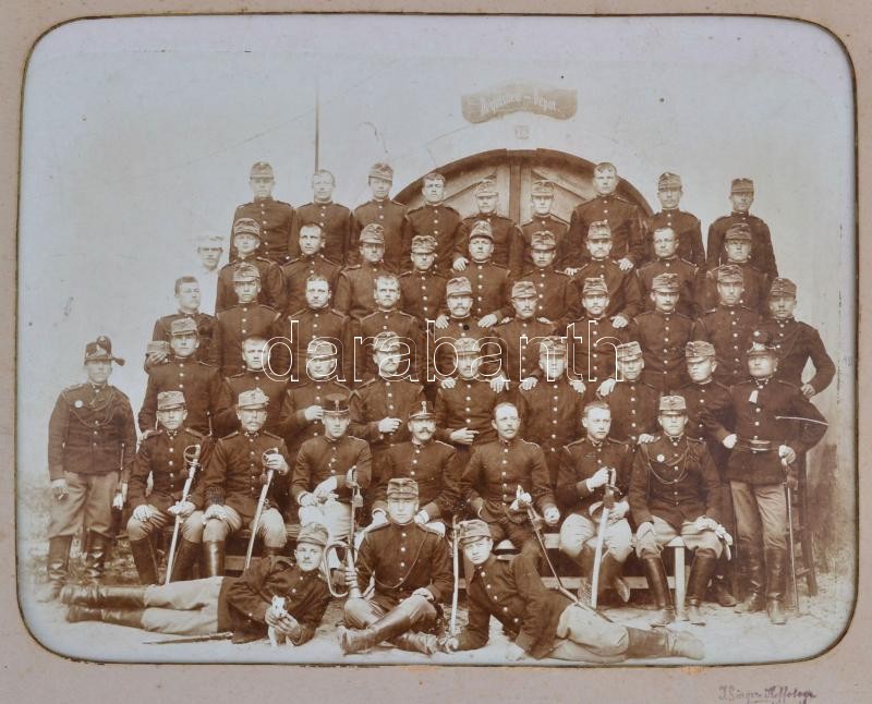 cca 1900 Újvidék, Osztrák-magyar katonák csoportképe, "Requisiten-Depot 26." felirattal felettük, az utolsó előtti sor szélén szakáccsal (?), az ülő sorokban tisztekkel, a fekvők között trombitással, kiskutyával, fotó kartonon paszpartuban, Neusatz/Újvidék/Novi Sad, J. Singer, sérült a paszartu elvált a kartontól, a karton sérült, a felületén sérülésnyomokkal, 21,5x24,5 cm
