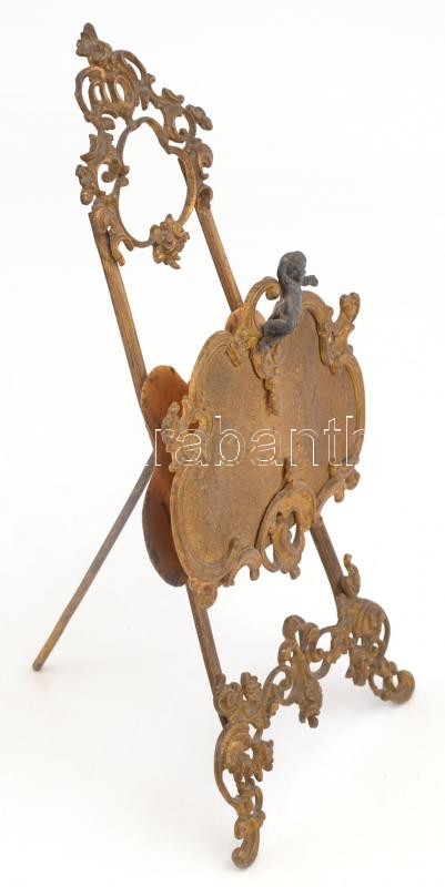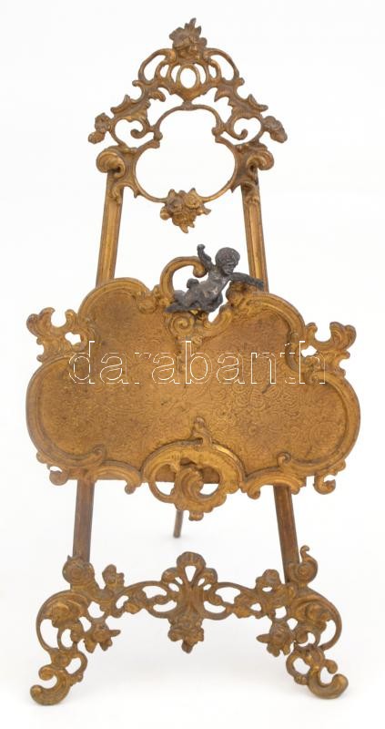 Leírás: Barokk, tűzaranyozott, fém asztali levéltartó állvány puttós díszítéssel. Hátul javított. 27 cm