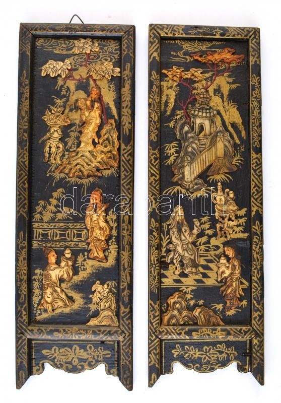 Leírás: Keleti festett gyöngyház és fa fali dísz 2 db 13x41 cm