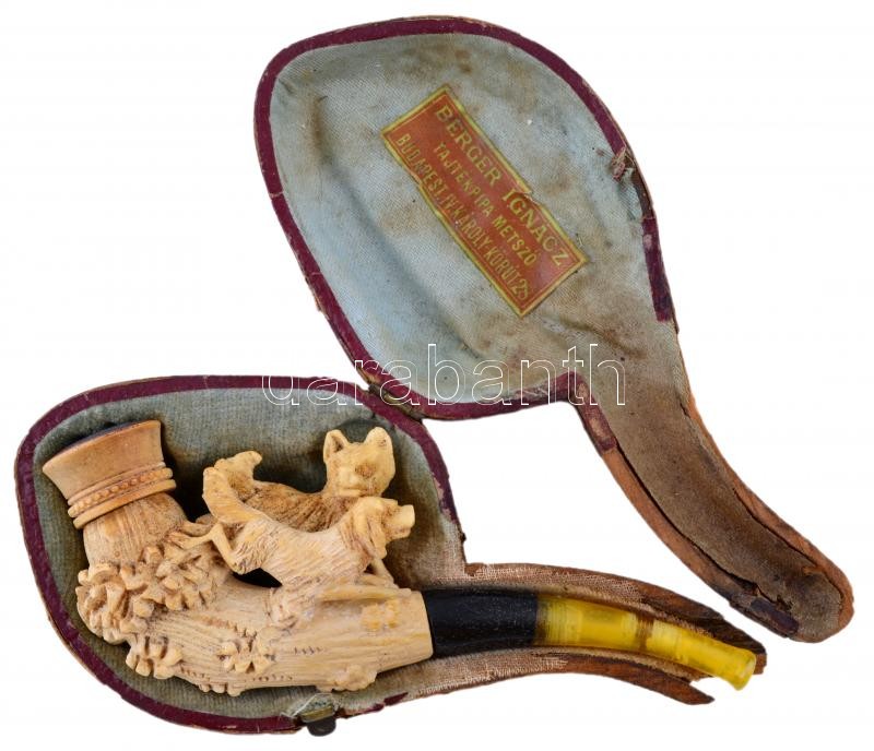 Leírás: Régi, kézzel faragott vadászjelenetes tajtékpipa, Berger Ignác tajtékpipa metsző feliratos tokban, h: 12 cm