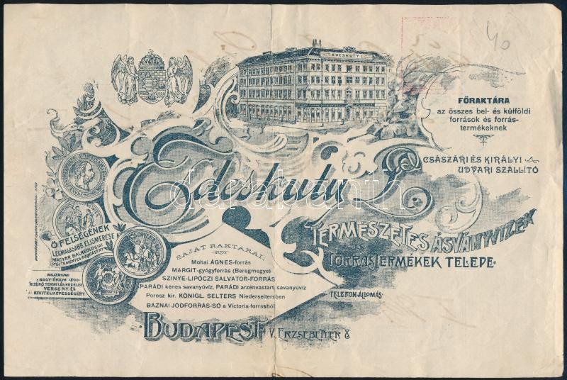 Leírás: 1912 Bp., Édeskuty László Természetes Ásványvizek és Forrástermékek telepe díszes számla