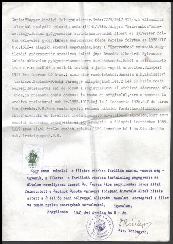 1926-1941 Illetékbélyeggel ellátott, közjegyző által hitelesített másolat arról, hogy a nagyilondai (Erdély) Szarvas Gyógyszertár üzleti jogát Sylvester Zoltán okleveles gyógyszerész szerezte meg 1926-ban, erdélyi gyógyszerészeti emlék, hajtva, jó állapotban