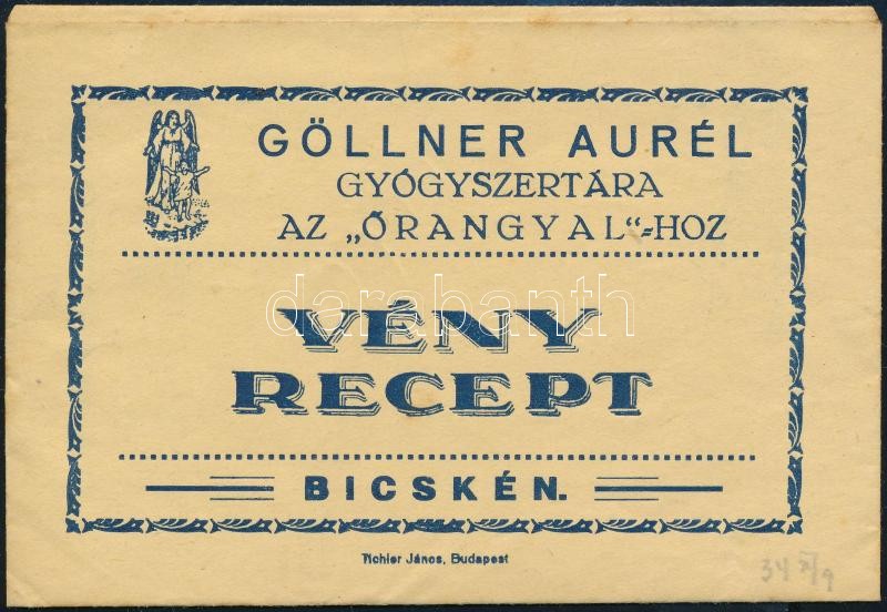 1934 Bicske, Göllner Aurél Gyógyszertára az "Őrangyal"-hoz gyógyszertári recept boríték, benne recepttel (Felcsút, Dr. Csókás István), valamint benne még Coramin prospektussal.