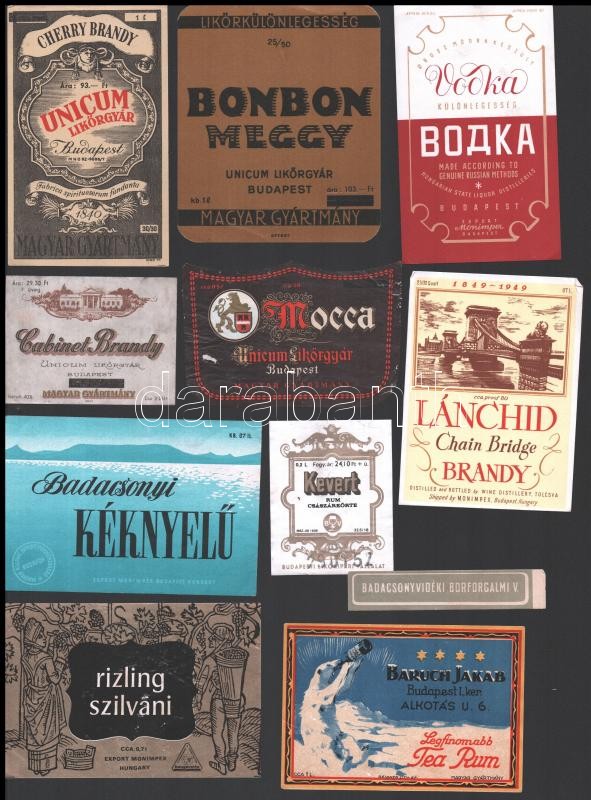 Leírás: Magyar italcímkék (Márka, Cherry Brandy, stb.), közte sérült