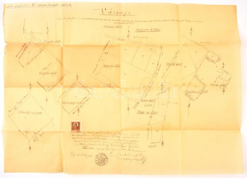 1933 Sárvár környéki dűlők vázrajza (Nagytóti-, Szegréti-, Kőris eleje nyugati-, Félréti-, Kőris eleje keleti Ölbői úti-, Boglószegi-, Cenzusi dűlő), 1: 2880 m. méretaránnyal, 2 P okmánybélyeggel, Sárvári Kir. Járásbíróság pecsétjével, másolat, szakadásokkal, 44x62 cm