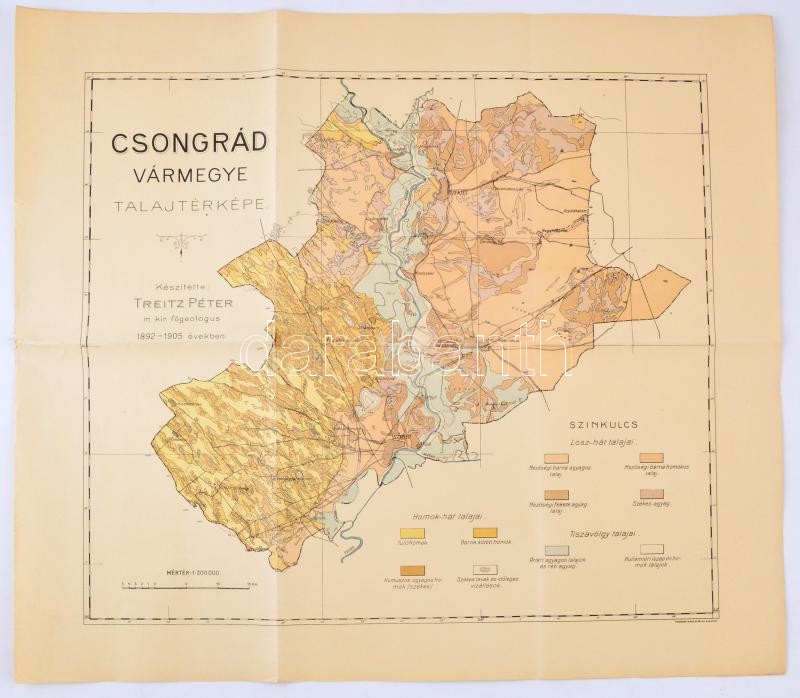 cca 1905 Csongrád vármegye talajtérképe, 1:200.000, készítette Treitz Péter m. kir. főgeologus 1892-1905 években, litográfia, Bp. Klösz Gy. és fia, a hajtás mentén kis szakadással, 57x63 cm