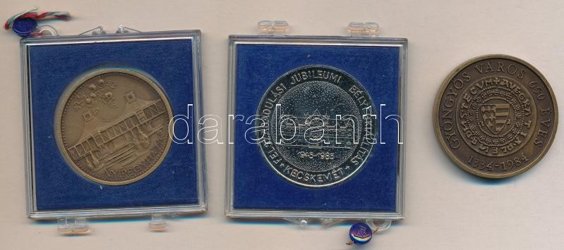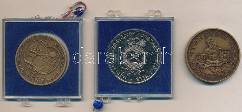 Leírás: Bognár György (1944-) 1984. "MÉE Gyöngyösi Csoport - Gyöngyös város 650 éves" Br emlékérem (42,5mm) + 1985. "Magyar Bélyeggyűjtők Országos Szövetsége / Felszabadulási Jubileumi Bélyegkiállítás - Kecskemét" fém emlékérem plombált plasztiktokban + Tóth Sándor (1933-) 1994. "Szabolcs Szatmár Megyei Idegenforgalmi Hivatal / Nyíregyháza" Br emlékérem sérüét plombált plasztiktokban (40mm) T:1,1-