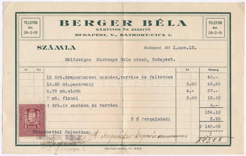 1931. "Berger Béla kárpitos és diszitő" kitöltött számla + 1934. "Hütt... https://www.darabanth.com/hu/365-Gyorsarveres/365.0/Numizmatika/Numizmatikaval-kapcsolatos-egyeb-tetelek~2000003/1931-Berger-Bela-karpitos-es-diszito-kitoltott-szamla-plus-1934-Huttl-Tivadar-Porcellangy~II2114921