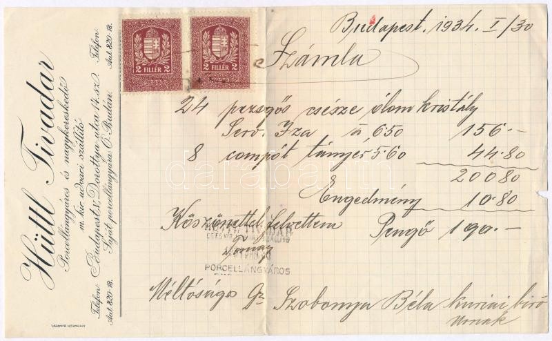Leírás: 1931. "Berger Béla kárpitos és diszitő" kitöltött számla + 1934. "Hüttl Tivadar Porcellángyáros és nagykereskedő" kitöltött számla, mindkettő bélyeggel T:II-