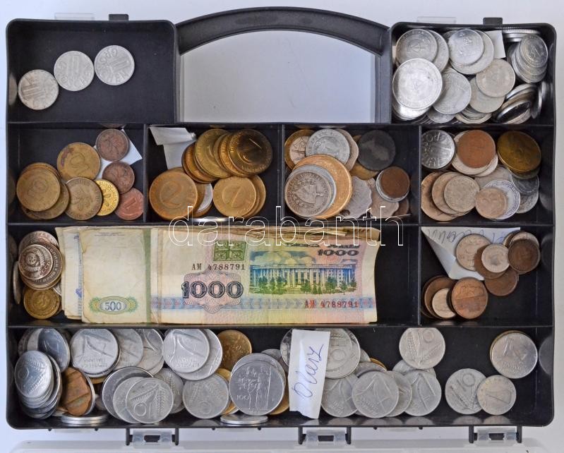 Vegyes külföldi fémpénz és bankjegy tétel 2kg-os súlyban, dobozban, közte olasz, német, szovjet fémpénzek, közte Kuba 1948. 20c Ag T:vegyes