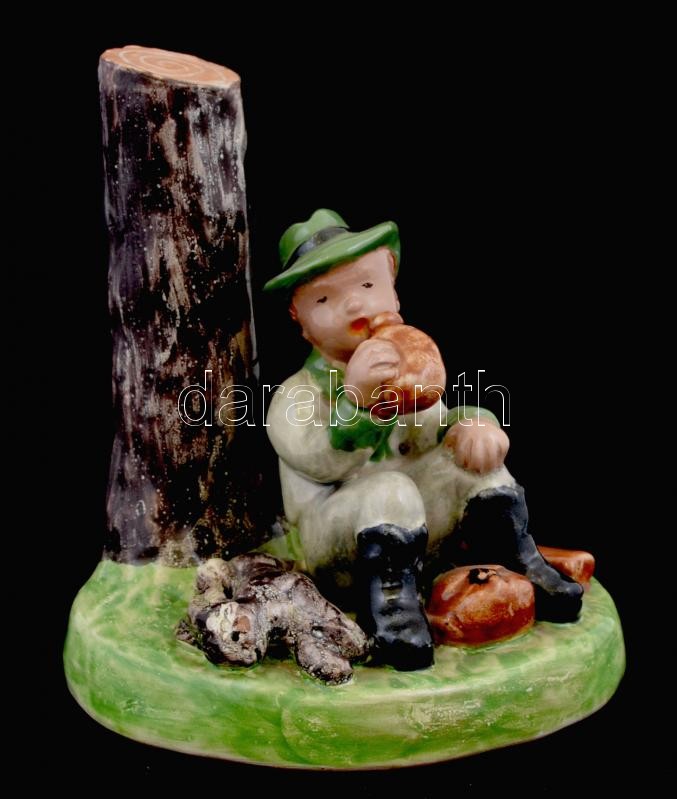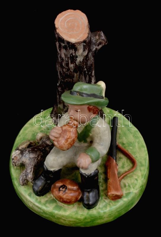 Leírás: Szécsi kerámia, falatozó vadász fiú kézzel festett mázas kerámia, jelzett, hibátlan. m: 16 cm