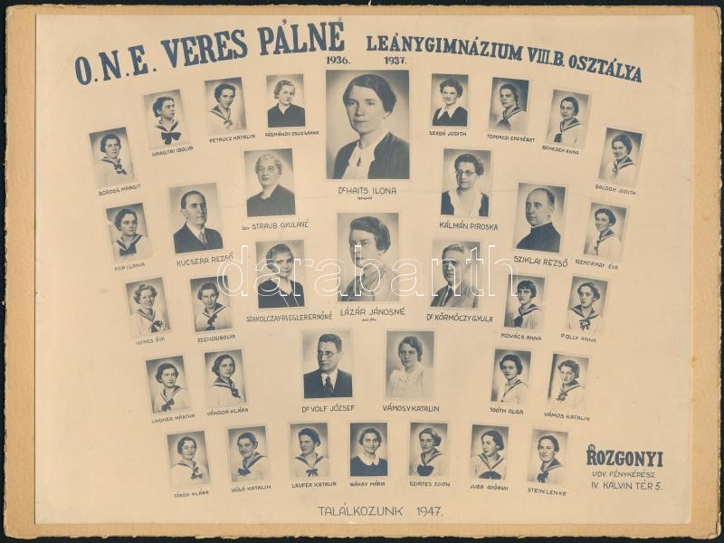 1937 Budapest, a Veres Pálné Leánygimnázium tanári kara és végzett növendékei, kistabló nevesített portrékkal, Rozgonyi udvari fényképész műterméből, 17x22 cm, karton 18x24 cm