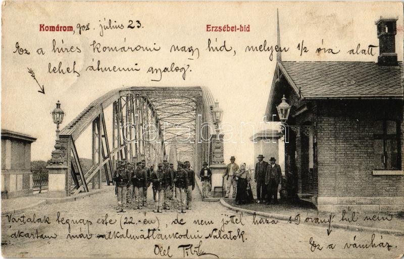 1908 Komárom, Komárnó; Erzsébet híd, Császári és Királyi hadsereg kato... https://www.darabanth.com/hu/366-Gyorsarveres/366.0/Kepeslapok/Felvidek~1500007/1908-Komarom-Komarno-Erzsebet-hid-Csaszari-es-Kiralyi-hadsereg-katonai-bridge-soldie~II2121964