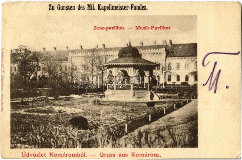 Leírás: Komárom, Komárnó; Zene pavilon. Schönwald T. kiadása / Zu Gunsten des Mil. Kapellmeister Fondes / music pavilion (EK)