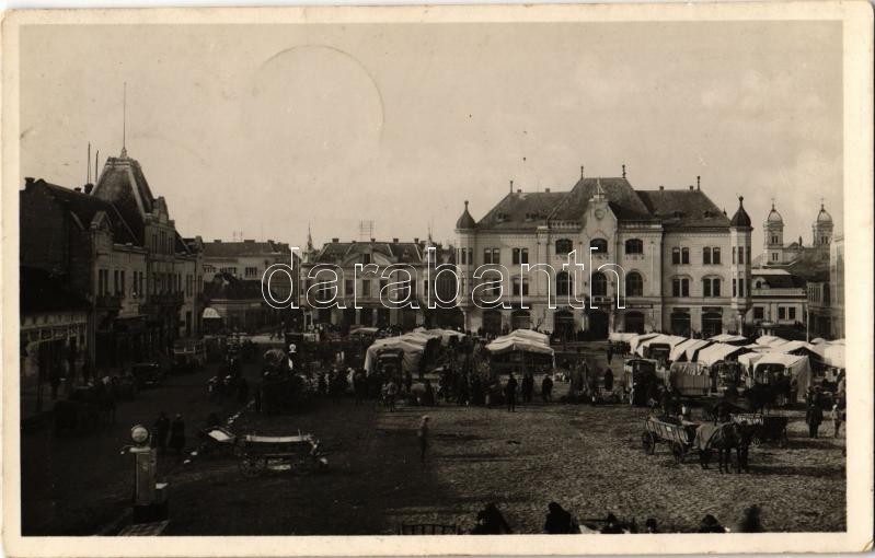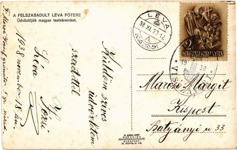 Léva, Levice; Fő tér, Üdvözöljük magyar testvéreinket! bevonulás, piac, Singer, Ignác Trebitsch, Pál L., Vámos, Borcsányi és Csernák és Kürti üzlete, autóbusz / entry of the Hungarian troops, market, shops, autobus + "1938 Léva visszatért" So. Stpl