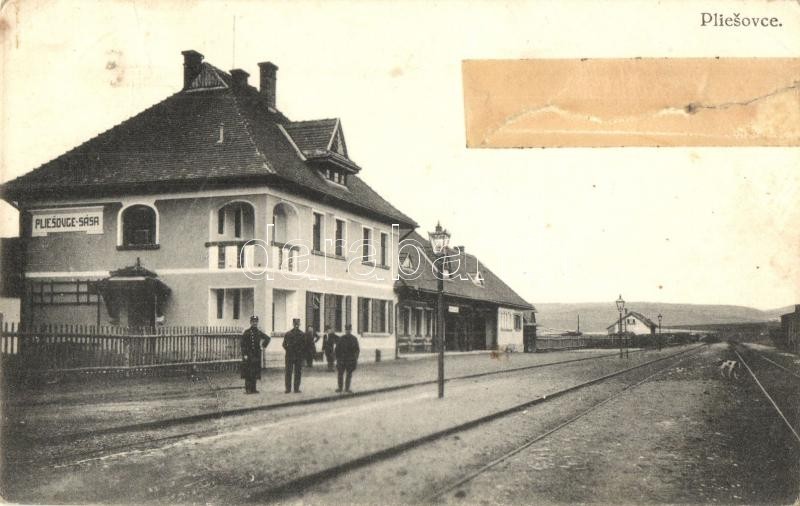 Leírás: Tótpelsőc, Pliesovce; Pliesovce-Sása nadrazie / Tótpelsőc-Szászpelsőc vasútállomás, vasutasok / Bahnhof / railway station, railwaymen (r)