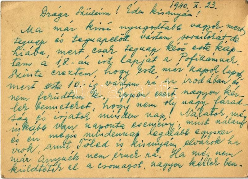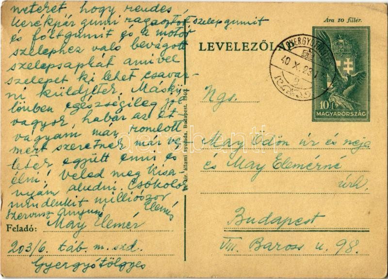 1940 May Elemér zsidó 203/6. táb. KMSZ (közérdekű munkaszolgálatos) levele szüleinek és feleségének a gyergyótölgyesi munkatáborból / WWII Letter from a Jewish labor serviceman to his parents and wife from the labor camp of Tulghes. Judaica (EK)