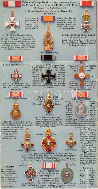 Orden und Ehrenzeichen österr-ungar. Heeresangehöriger für Verdienste vor dem Feinde im Weltkrieg 1914-1915. / Orders and decorations of the Austro-Hungarian (K.u.K.) army for merits before the enemy in World War I. 1914-1915. 3-tiled folding postcard