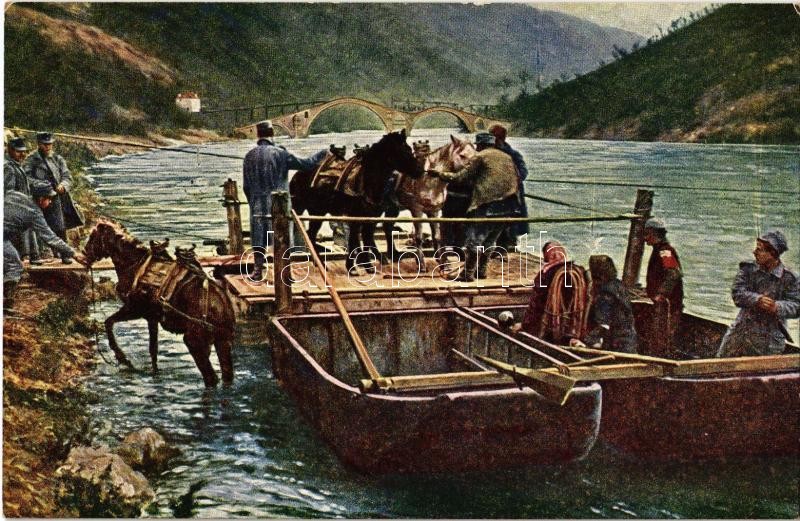 Weltkrieg 1914-1916. Überschiffung der Verpflegsstaffel über den schwarzen Drin / Élelmezési csoport áthajózása a Fekete-Drin folyón / WWI Austro-Hungarian K.u.K. military, transport of a catering group over the Black Drim river