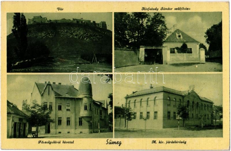 Leírás: Sümeg, Vár, Kisfaludy Sándor szülőháza, Főszolgabírói hivatal, M. kir. Járásbíróság
